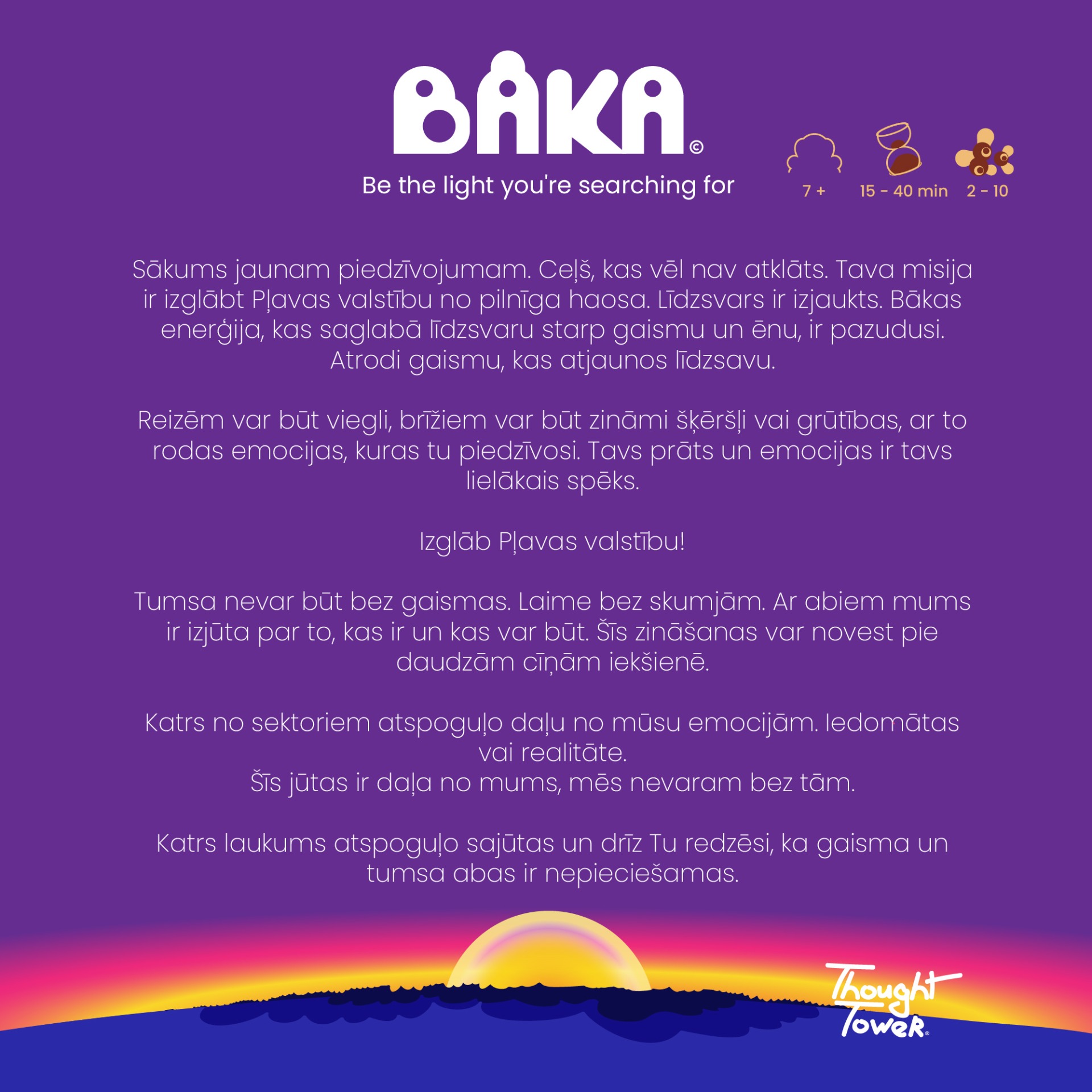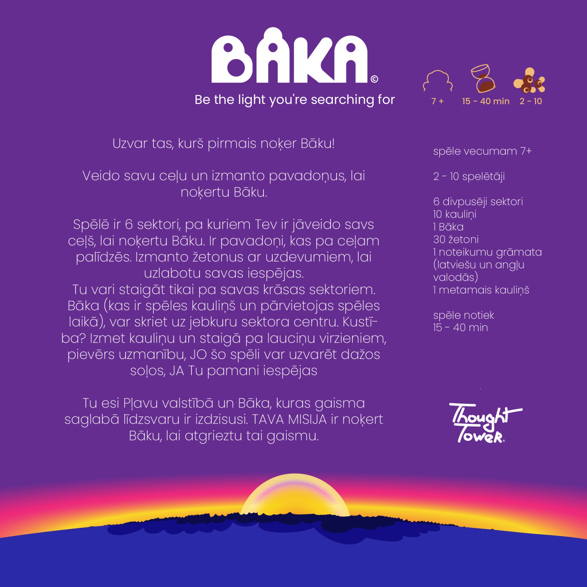 Vecums 7+, Spēlētāji 2 - 10, Ilgums 15 - 40 min, latviešu un angļu valodā (abas iekļautas).